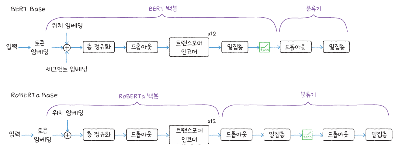 후속 모델 RoBERTa는 훈련 데이터 규모를 확장해 정확도를 높였고, DistilBERT는 지식 정제(Knowledge Distillation) 기법으로 BERT의 크기를 절반으로 줄였습니다. 두 모델 모두 허깅페이스 transformers 라이브러리에서 바로 불러와 사용할 수 있습니다.