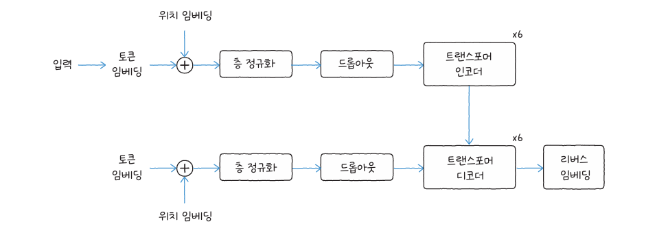 입력 문장은 토큰 단위로 분리된 후 임베딩 과정을 거쳐 모델에 전달됩니다. 여기에 단어의 순서를 반영하기 위해 위치 임베딩이 추가됩니다. 이후 여러 개의 셀프 어텐션(Self-Attention) 층을 통과하며 문맥 정보를 학습합니다.