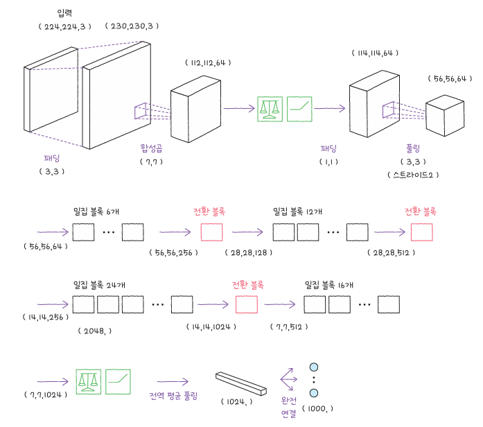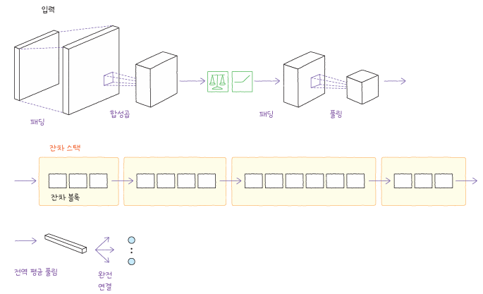 ResNet의 잔차 블록에는 배치 정규화(batch normalization) 함께 적용됩니다. 이 정규화는 학습 과정에서 각 층의 분포를 일정하게 유지시켜, 훈련이 안정적으로 진행되도록 돕습니다. 케라스에서는 ResNet50, ResNet101 등의 사전 훈련 모델을 불러와 이미지 분류에 활용할 수 있습니다.
