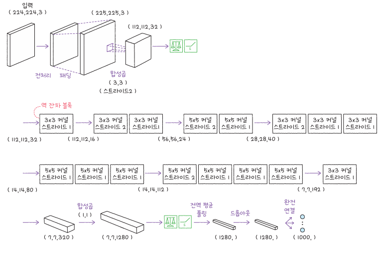 EfficientNet은 MobileNetV2의 아이디어를 확장해, 층의 수, 채널의 수, 입력 해상도를 일정한 비율로 조정하는 복합 스케일링(compound scaling) 방식을 사용합니다. 이 덕분에 모델 크기(EfficientNetB0~B7)를 유연하게 선택할 수 있으며, 작은 모델에서도 뛰어난 효율과 성능을 보여 줍니다.