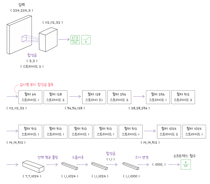 MobileNet은 계산 효율을 극대화한 모델입니다. 합성곱 연산을 일반적인 방식 대신, 깊이별 합성곱(depthwise separable convolution)으로 나누어 수행합니다. 이 방식을 통해 파라미터 수를 크게 줄이면서도 비슷한 수준의 정확도를 달성할 수 있습니다. 덕분에 스마트폰이나 임베디드 환경에서도 실시간으로 이미지 인식이 가능합니다.