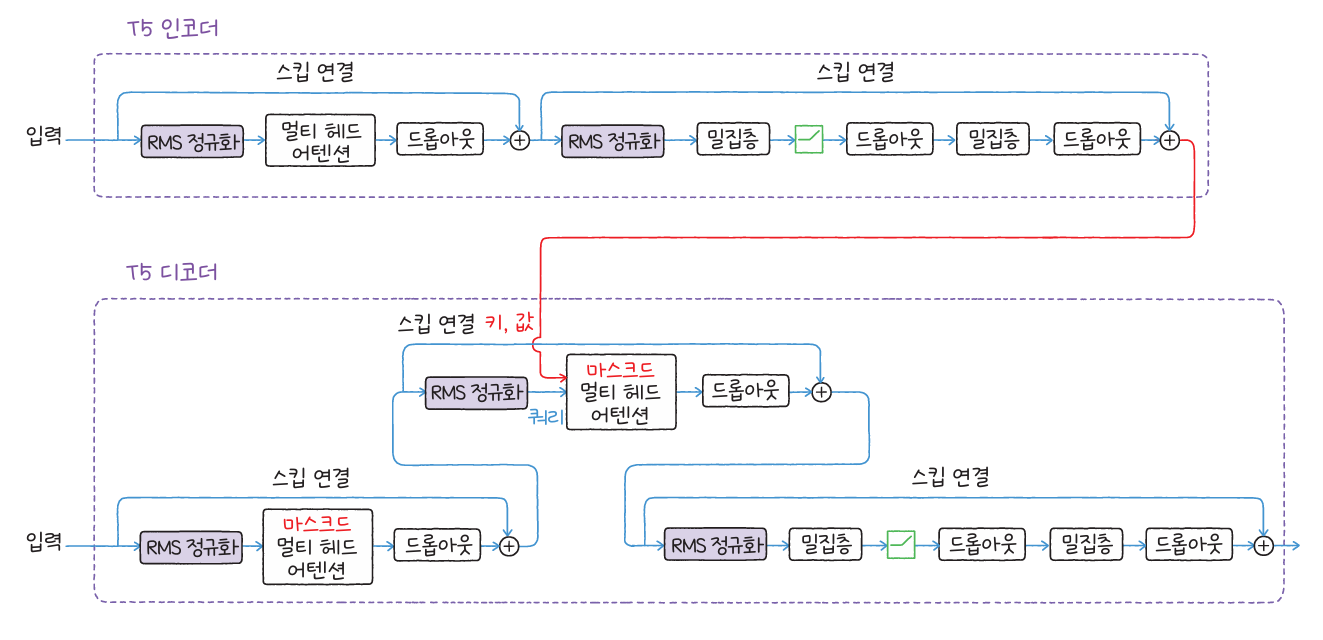 T5는 모든 자연어 처리 작업을 “텍스트 입력 → 텍스트 출력”이라는 하나의 형식으로 통합한 모델입니다. BART와 유사한 구조를 가지지만, 절대 위치 임베딩 대신 상대 위치 임베딩을 사용하여 문장 길이에 더 유연하게 대응합니다. 또한 T5-1.1 버전에서는 활성화 함수를 GeGLU로 변경하고, 피드 포워드 네트워크의 구조를 개선해 성능을 높였습니다.