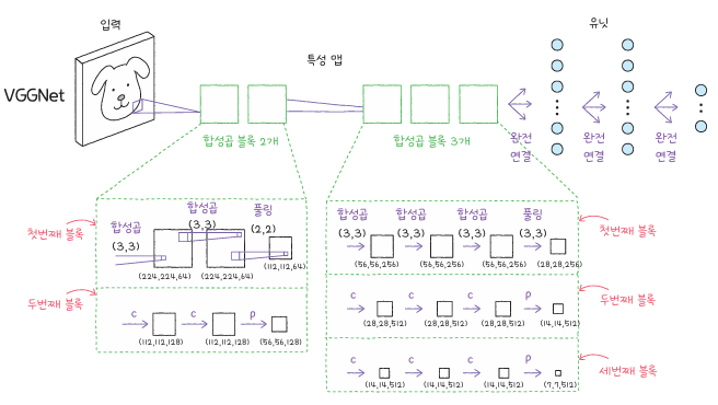 VGGNet의 가장 큰 특징은 3×3 크기의 합성곱 필터를 연속적으로 사용하는 점입니다. 이 방식은 계산량을 크게 늘리지 않으면서 더 깊은 네트워크를 구성할 수 있게 해 줍니다. 케라스의 keras.applications 모듈을 사용하면 VGG16, VGG19 모델을 불러와 바로 사용할 수 있으며, 이미지넷 데이터셋에서 사전 훈련된 가중치를 함께 제공합니다.
